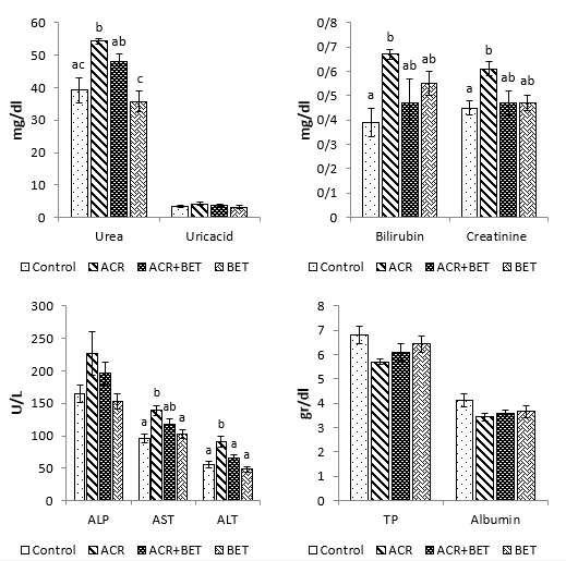 Various studies have been conducted in recent years to evaluate the effectiveness of some antioxidant compounds in improving the damage caused by toxicants. Although betaine was first identified in sugar beet juice, it has since been found in various other organisms. Once the body absorbs it, betaine plays a crucial role in preserving the well-being of critical organs, such as the liver, cardiovascular system, and kidneys [17, 18]. Betaine plays a vital role in protecting cells from stress by serving as an organic osmolyte. It also serves as a valuable source of methyl groups for the methionine cycle, leading to the formation of critical compounds. Moreover, betaine exhibits powerful antioxidant characteristics that assist in eliminating ROS. Additionally, it contributes to the body's defense system against oxidation through its involvement in sulfur amino acid metabolism [17-19]. Betaine has shown promising results as a therapeutic agent in protecting against chemical-induced kidney and liver damage [20]. This study aimed to investigate the potential benefits of betaine in protecting against ACR-induced liver and kidney damage in rats.