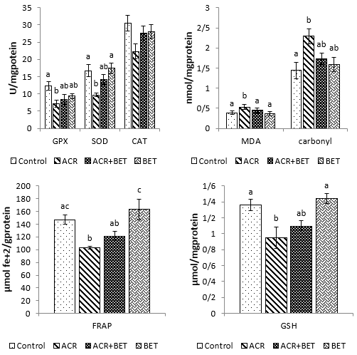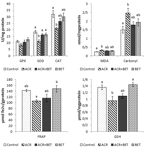 Previous studies have reported that betaine elevates the levels of certain antioxidant indices in various types of toxicant exposures and oxidative stress [38-40]. Moreover, hesperidin and diosmin, two antioxidant flavone glycosides, are effective in enhancing the SOD, GPX, and CAT activities in the brain, kidney, and liver of rats exposed to ACR [36]. According to reports, the use of betaine has been linked to enhanced levels of GSH that have been depleted as a result of acetaminophen consumption [41] and can normalize the changed activities of SOD, CAT, and GPX in carbon tetrachloride-intoxicated animals [24].