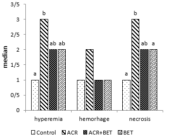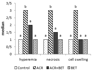 Figure 5. Hyperemia, Necrosis, Swelling of Cells in Kidney Tissue. Columns without common letters indicate a significant difference (P < 0.05).
