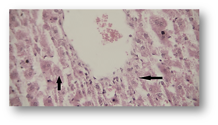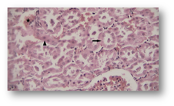 Figure 6. Photomicrograph of Observed Hepatc Histopathological Features (Hematoxylin and Eosin [H&E],×100) in the Acrylamide (ACR)-Treated Group. Hyperemia (star) and necrosis (arrow).
