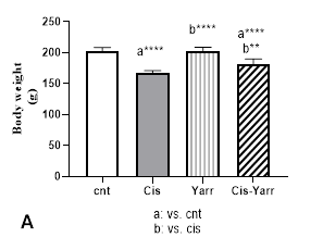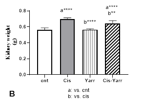 In this research, four groups of animals (the average weight was close) were selected, then body weight and kidney weight were evaluated on the sixth day after a single dose of cisplatin. The Cisplatin group indicated a significant weight loss compared to the control group (P<0.0001). Yarrow extract treatment for 5 days before and 5 days after cisplatin injection had modulating effects on cisplatin-induced body weight loss (P<0.01, Figure 1A). However, it was observed that the average weight of the Cis-Yarrow group was significantly different from the average weight of the control group (P<0.0001, Figure 1A).