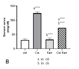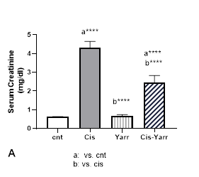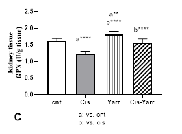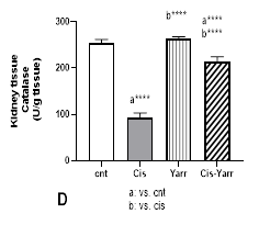 In the examination of the average kidney weight, the cisplatin group showed a significant increase compared to the control group (P<0.0001). Yarrow extract treatment for 5 days before and 5 days after cisplatin injection led to an improvement in the kidney weight of the Cis-Yarrow group compared to the cisplatin group (P<0.01); however, it was still significantly different from the control group (P<0.0001) (Figure 1B).
