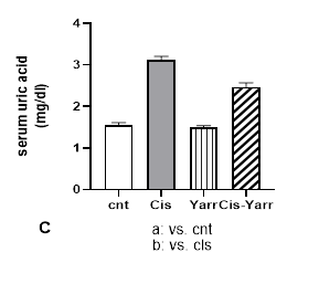 In the present study, nephrotoxicity was induced by the injection of a single dose of cisplatin (6 mg/kg bw, i.p). According to findings, kidney damage was confirmed by changes in kidney damage parameters, including creatinine, urea, and uric acid, an increase in MDA, a decrease in albumin, an increase in TNFα level as an inflammatory factor, and a reduction in tissue antioxidant indices.