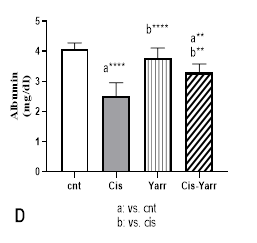 Figure 2. Effect of Yarrow extract on serum indicators of cisplatin-induced nephrotoxicity. (A: creatinine, B: urea, C: uric acid, and D: albumin). Nephrotoxicity was induced in rats by administration of a single dose of cisplatin (6 mg/kg body weight, i.p) and Yarrow extract (250 mg/kg body weight, gavage) 5 days before cisplatin treatment and until the end of the experiment (5 days later). Values are expressed as mean±SD (n=6). The results demonstrate that Yarrow extract reduces cisplatin-induced nephrotoxicity. (****P<0.0001 and **P<0.01).