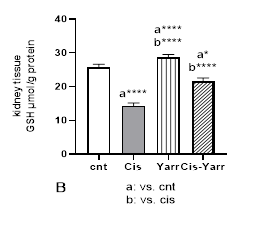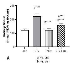 Lipid peroxidation is measured based on thiobarbituric acid reactive substances (TBARS) expressed as MDA level. In this study, MDA in kidney tissue of the cisplatin group increased significantly compared to the control group (P<0.0001, Figure 3 A). Administration of Yarrow extract significantly improved the high MDA level caused by cisplatin (Cis-Yarrow group, compared to cisplatin group, P<0.0001); however, the reduction of MDA level did not reach the level of the control group, and the difference was significant (P<0.001, Figure 3 A).