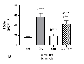 In the examination of the changes in TNFα level, it was observed that Yarrow extract was able to significantly reduce the inflammation caused by cisplatin (P<0.001); however, it could not reach the level of the control group) Cis-Yarrow group, compared to the control group, P<0.0001, Figure 3 B).