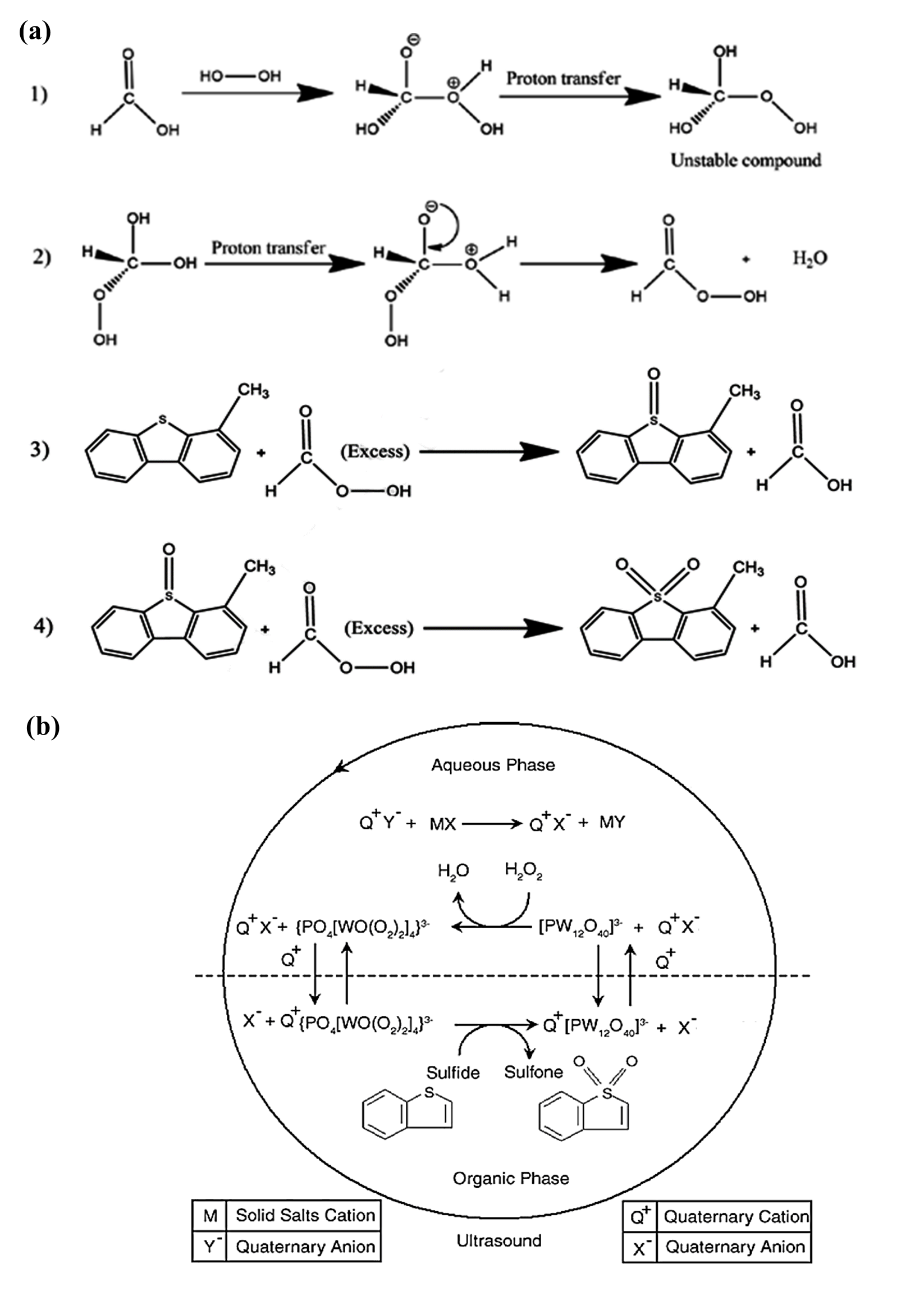 According to the experimental methods, hydrogen peroxide converts to free radicals in the reaction between catalyst and oxidizer. The reactions in the absence and presence of the PTC are shown in Figure 2 (a) and Figure 2 (b), respectively. This reaction includes two steps. First, peroxyformic acid, an unstable compound, is produced as a result of the reaction between hydrogen peroxide and formic acid/acetic acid in the aqueous phase. Second, peroxyformic acid is transferred to the organic phase, where sulfur-containing compounds such as dibenzothiophene are converted to sulfones and sulfoxides. Moreover, the reaction mechanism of phosphotangestic acid with S-containing hydrocarbons is shown in Figure 2.