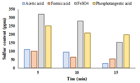 Moreover, the effect of reaction time for sulfur removal is shown in Figure 4. The experiments were done during the 15 min. According to Figure 4, the increasing reaction time enhanced sulfur removal. However, the time increase improved sulfur removal, but the decline of operation cost is needed to identify the optimum time. H2O2, as the most common oxidant in the UAOD process, is a friendly environmental material. However, the increasing H2O2 enhances sulfur removal, but economic consideration should be noticed. One of the main topics in the ODS process is the recovery of chemical residues. Therefore, minimization of chemicals is essential.