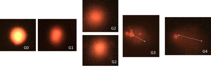 Figure 2: Shape movements of comet tails. Based on the intensity of the head and tail, there are five classifications. An integer between 0 and 4 was assigned to each category :( 0) = minimal damage and (4) = severe damage (i.e. almost all DNA in the tail) [17].