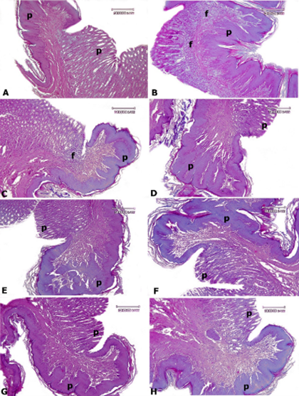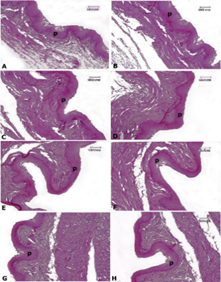 Figure 1. Rat esophagus tissue, A: control group, B: AlP-5 group, C: AlP-4 group, D: A2 group, E: B2 group, F: C2 group, G: AD1, H: AD3. In all groups, an almost normal structure with a fatty esophagus and a normal squamous epithelium (p) is observed—Hematoxylin-eosin staining.