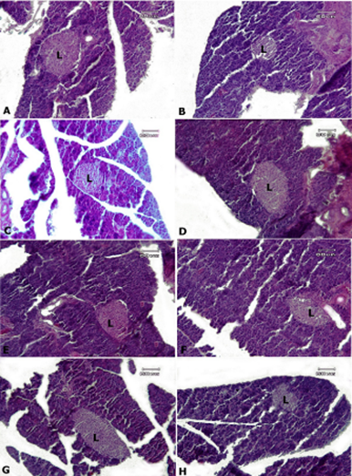 Figure 2. Rat pancreas tissue, A: control group, B: AlP-5 group, C: AlP-4 group, D: A2 group, E: B2 group, F: C2 group, G: AD1, H: AD3. In all groups, normal structure is observed in pancreatic acini and islets of Langerhans (L)—Hematoxylin-eosin staining.