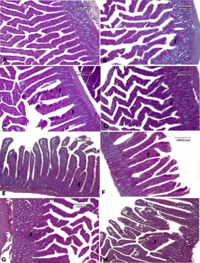 Figure 4. Rat intestinal tissue, A: control group, B: AlP-5 group, C: AlP-4 group, D: A2 group, E: B2 group, F: C2 group, G: AD1, H: AD3. In the control group, normal structure is observed in the intestinal tissue. In the other test groups, mild mononuclear enteritis (f) was present in the mucosa and submucosa of the intestinal tissue—Hematoxylin-eosin staining.