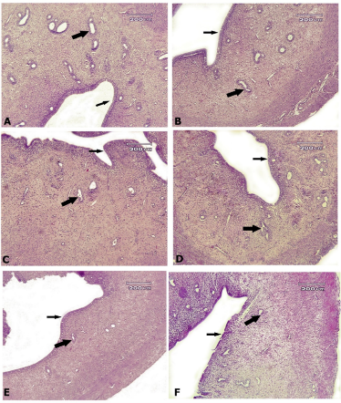Figure 5. Rat uterine tissue, A: control group, B: AlP-5 group, C: AlP-4 group, D: A2 group, E: B2 group, F: C2 group. In all groups, an almost normal structure is observed, with uterine fat in the normal epithelium (small arrows) and uterine glands (big arrows)—Hematoxylin-eosin staining.