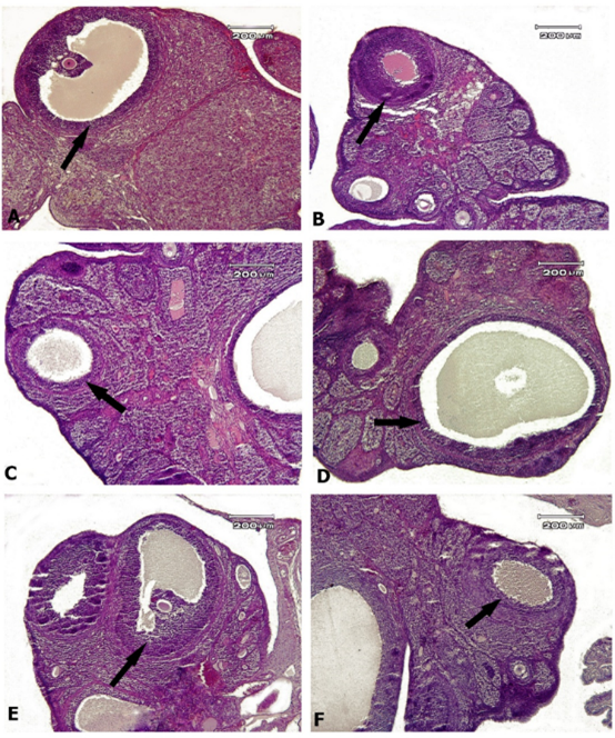 Figure 6. Rat ovary tissue, A: control group, B: AlP-5 group, C: AlP-4 group, D: A2 group, E: B2 group, F: C2 group. An almost normal structure with normal ovarian fat and active ovarian follicles (arrows) is observed in all groups—Hematoxylin-eosin staining.