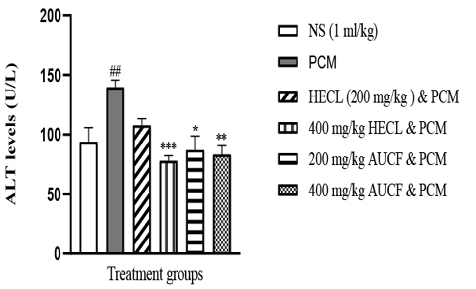 Figure 1. Showing ALT levels across all groups (n = 5). ##p < 0.01 versus N.S, *p < 0.05, **p < 0.01, ***p < 0.001 versus PCM. NS: Normal Saline, PCM: Paracetamol, HECL: Hydroethanol C. papaya leaf, AUCF: Aqueous unripe C. papaya fruit, ALT: Alanine aminotransferase