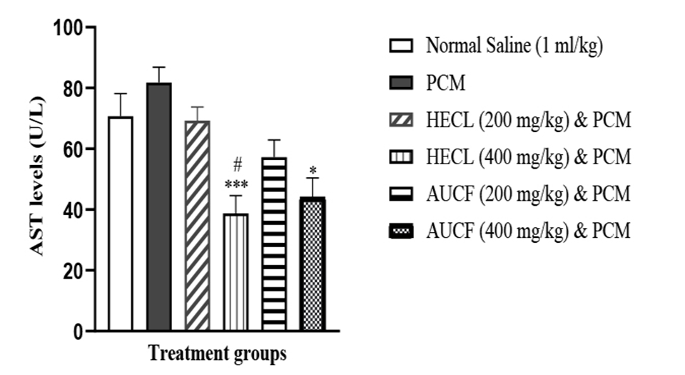 Figure 2. Showing AST levels across all groups (n = 5). #p < 0.05 versus N.S, *p < 0.05, ***p < 0.001 versus PCM. NS: Normal Saline, PCM: Paracetamol, HECL: Hydroethanol C. papaya leaf, AUCF: Aqueous unripe C. papaya fruit, AST: Aspartate aminotransferase