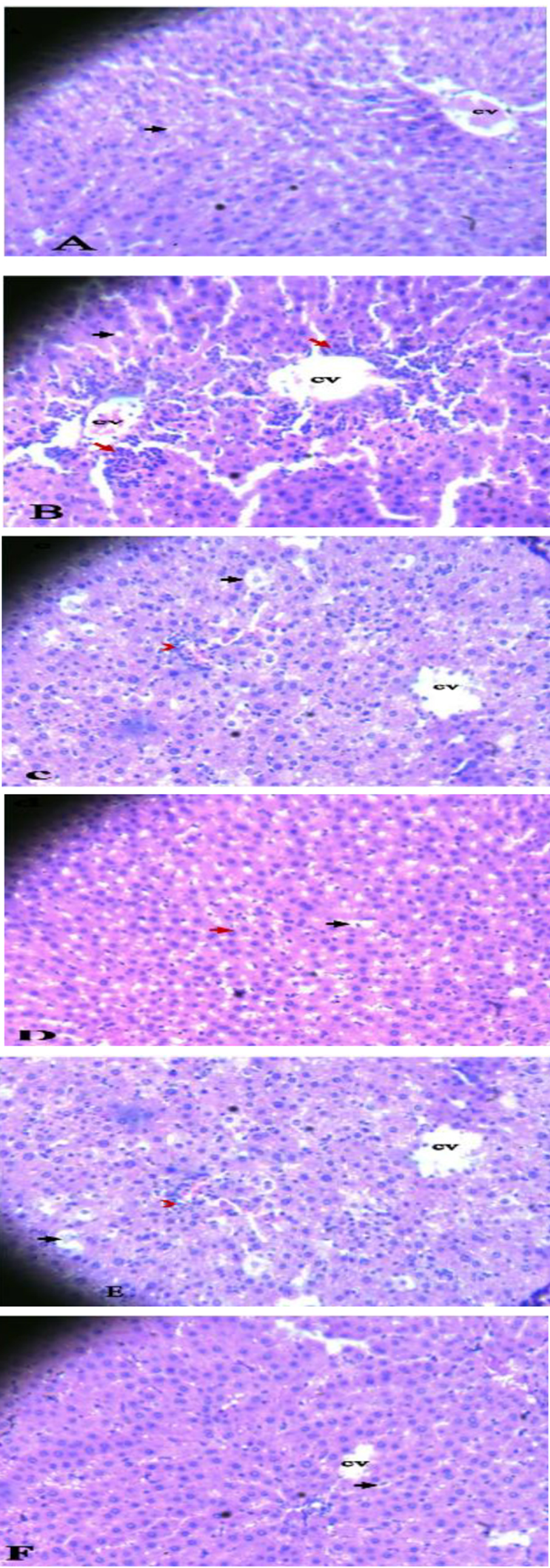 Figures 4. A-F showing photomicrographs of liver tissues in all groups. The NS group (Figure 4A), PCM group (Figure 4B), HECL (200 mg/kg) & PCM and AUCF (200 mg/kg) & PCM (Figures 4C and 4E, respectively). HECL (400 mg/kg) & PCM and AUCF 400 mg/kg & PCM (Figures 4D and 4F, respectively). Central vein (CV); Hepatocytes (Black arrow); inflammatory cells (red arrow). Where NS: Normal Saline (1 ml/kg); PCM: paracetamol (600 mg/kg); HECL: hydroethanol C. papaya leaf; AUCF: aqueous unripe C. papaya fruit