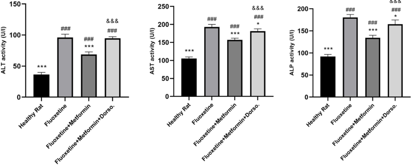 Figure 1. Comparison of the effect of drug administration on serum ALT, AST, and ALP activity. Group I: Healthy rats, Group II: Fluoxetine, Group III: Fluoxetine + Metformin, Group IV: Fluoxetine + Metformin + Dorsomorphin. * P <0.05 vs Group II, *** p< 0.001 vs Group II, ### p< 0.001 vs Group I, &&& p< 0.001 Group IV vs Group III.