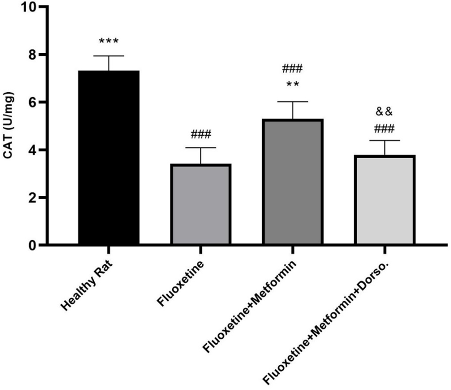 Figure 2. Comparison of the effect of drug administration on catalase (CAT) activity. Group I: Healthy rats, Group II: Fluoxetine, Group III: Fluoxetine + Metformin, Group IV: Fluoxetine + Metformin + Dorsomorphin. ** P <0.01 vs Group II, *** p< 0.001 vs Group II, ### p< 0.001 vs Group I, && p< 0.01 Group IV vs Group III.