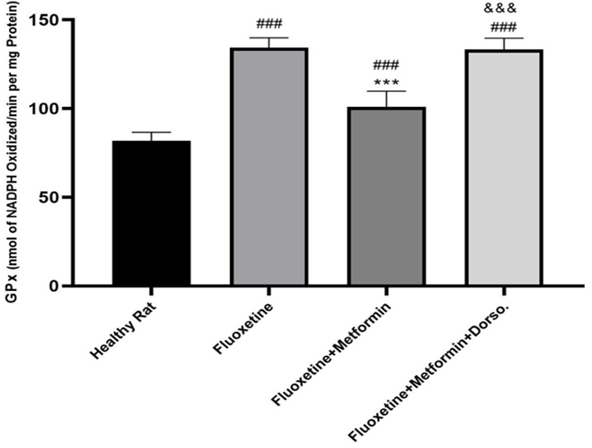 Figure 3. Comparison of the effect of drug administration on GPx activity. Group I: Healthy rats, Group II: Fluoxetine, Group III: Fluoxetine + Metformin, Group IV: Fluoxetine + Metformin + Dorsomorphin. *** p< 0.001 vs Group II, ### p< 0.001 vs Group I, &&& p< 0.001 Group IV vs Group III.