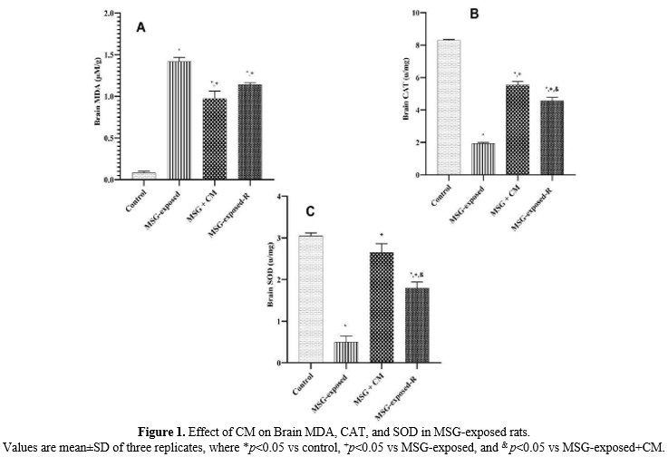In conclusion, the study suggests that CM supplementation can mitigate the neurotoxicity caused by MSG through antioxidant, anti-inflammatory, and anti-apoptotic mechanisms, potentially improving cognitive functions and integrity. Therefore, CM may serve as a therapeutic agent amenable to a diet that can neutralise MSG's neurotoxic effect.