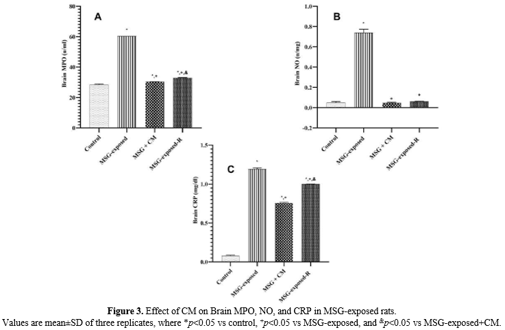 Effect of CM on Brain MPO, NO, and CRP in MSG-exposed rats