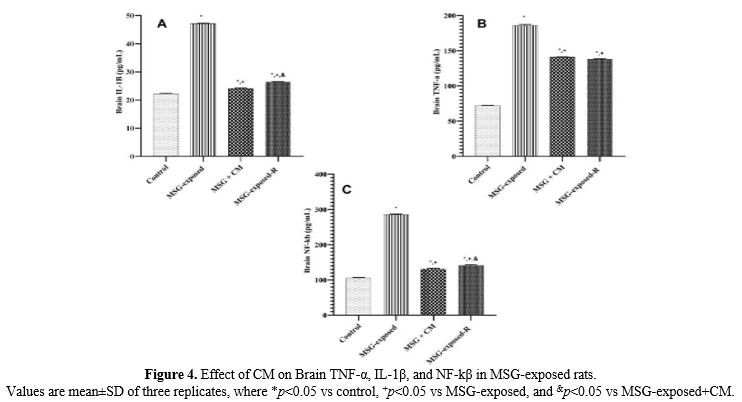 Effect of CM on Brain TNF-α, IL-1β, and NF-kβ in MSG-exposed rats