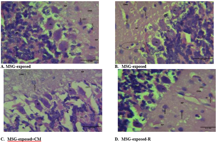 Photomicrograph (Figure 7 [A, B, C, and D]) demonstrated cerebellum histomorphology made up of its classical layers: the Grey matter consisting of the outer molecular layer (OML), Purkinje layer (PL), granular layer (GL), all dispersed within the neuropil (NP) and the White matter composed of neuronal axons and Glial cells. The blood capillaries appear normal and unremarkable. Features were consistent with normal cerebellar tissue.