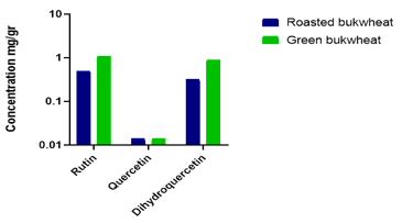 The content of dihydroquercetin was markedly higher in green buckwheat (0.9 mg/g) compared to roasted buckwheat (0.32 mg/g), indicating that thermal processing may lead to degradation of this compound. Similarly, the level of rutin was almost twice as high in green buckwheat (1.09 mg/g) as in roasted samples (0.5 mg/g), suggesting greater preservation of this flavonoid in unprocessed grains. In contrast, the concentration of quercetin remained unchanged (0.014 mg/g) in both forms, implying either thermal stability or naturally low abundance in buckwheat. These findings suggest that green buckwheat is a richer source of bioactive flavonoids, particularly rutin and dihydroquercetin, and may offer enhanced potential for use in functional foods aimed at antioxidant support and detoxification.