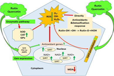 Figure 3. Proposed mechanism of rutin and quercetin action against OS. The flavonoids enhance antioxidant enzyme activities (SOD, catalase [CAT], GPx) and activate antioxidant-related genes via the SIRT1 pathway. This leads to reduced ROS, lipid peroxidation (MDA), and inflammation, supporting detoxification and cellular protection mechanisms