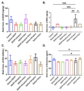 From the 5HT biochemical tests, it was observed that animals exposed to DVVP and then treated with atropine and citric acid showed an increased 5HT level in the brain. The administration of atropine as a treatment for rats exposed to DDVP showed no significant effect on the 5HT level in the brain. Upon co-administration of citric acid to the DDVP-treated animals, a significant ameliorative effect was observed on the 5HT level.