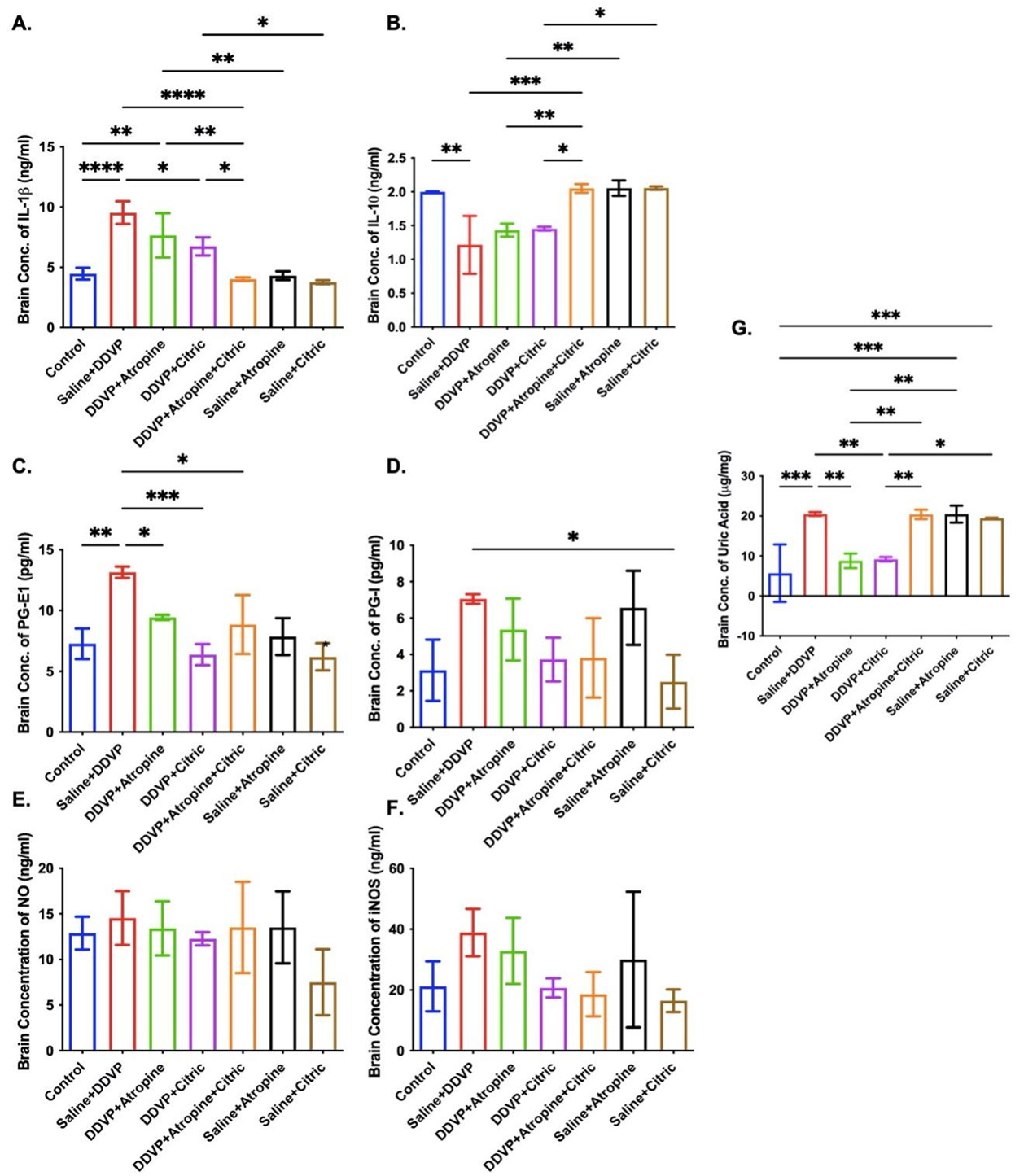 Figure 2. Graphical Representation Showing the Concentrations of Interleukin (IL)-1b (A), IL-10 (B), Prostaglandin (PG)-E1 (C), PG-I (D), Nitric Oxide (NO) (E), Inducible Nitric Oxide Synthase (iNOS) (F) and Uric Acid (G) in the Brains of Wistar Rats Exposed to Normal Saline (Control), DDVP, and Interventions or Control Ingestions of Atropine and Citric Acid. Asterisk (*, **, ***) indicates statistically significant differences. The data are presented as mean ± SEM, one-way ANOVA.