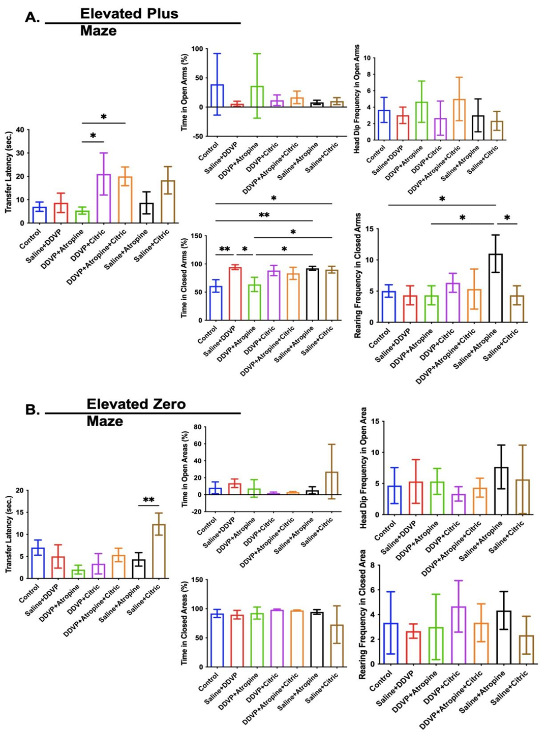 Figure 3. Graphical Representation Showing the Anxiety-Like and Exploratory Behaviours in the Elevated Plus Maze (A) and Elevated Zero Maze (A) in Wistar Rats Exposed to Normal Saline (Control), Dichlorvos (DDVP), and Interventions or Control Ingestions of Atropine and Citric Acid. Asterisk (*, **) indicates statistically significant differences. The data are presented as mean ± SEM, one-way ANOVA.