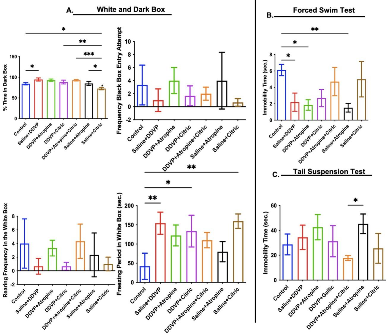 Figure 4. Graphical Representation Showing the Anxiety-Like Behaviors in the White and Dark Box (A) and Depressive-Like Behaviors in the Forced Swim Test (B) and Tail Suspension Test (C) in Wistar Rats Exposed to Normal Saline (Control), Dichlorvos (DDVP), and Interventions or Control Ingestions of Atropine and Citric Acid. Asterisk (*, **, ***) indicates statistically significant differences. The data are presented as mean ± SEM, one-way ANOVA.