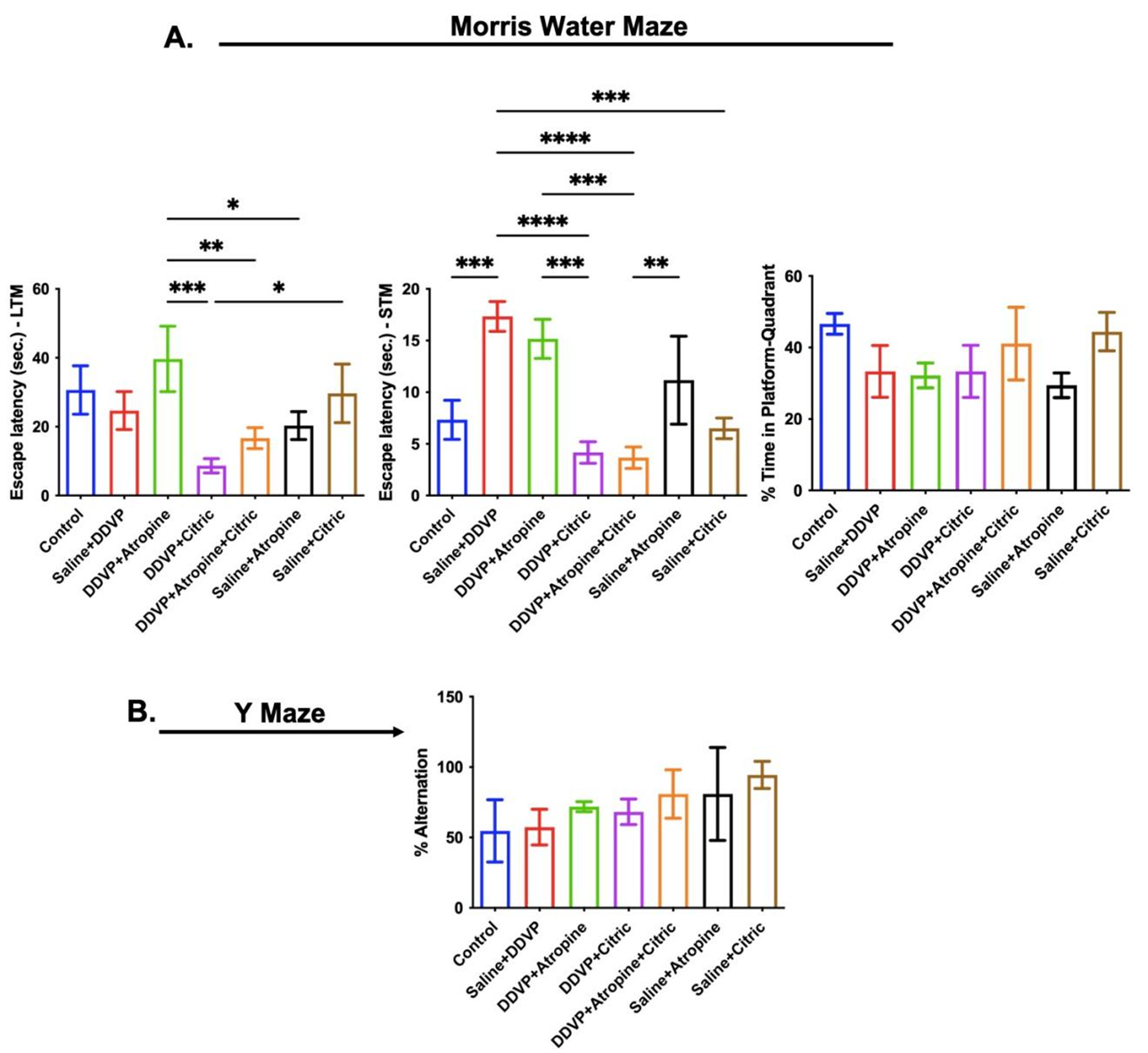 Figure 5. Graphical Representation Showing the Spatial Working Memory Behaviors in the Morris Water Maze (A) and Y Maze (B) Paradigms in Wistar Rats Exposed to Normal Saline (Control), Dichlorvos (DDVP), and Interventions or Control Ingestions of Atropine and Citric Acid. Asterisk (*, **, ***, ****) indicates statistically significant differences. The data are presented as mean ± SEM, one-way ANOVA.